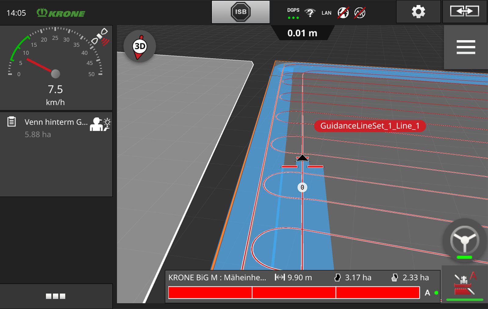 For the autonomous VTE, an endless tyre track is created on a computer in the office and transferred wirelessly to the machine. The planning of the endless tyre track for the BiG M self-propelled machine can also be done directly on the machine. After the system is activated, the mower conditioner equipped with the GPS Guidance steering system is responsible for working the field fully automatically. The BiG M is also able to turn automatically at the headland. The driver is relieved of tasks to a maximum extent and is able to concentrate fully on monitoring the process and the surrounding area. The tyre tracks for working the headland are planned for each specific process and machine while mowing by working the headland first, except for the escape side for wildlife, and then the inside of the field. When working the soil with the autonomous VTE, on the other hand, the inside of the field is processed first and then the headland.