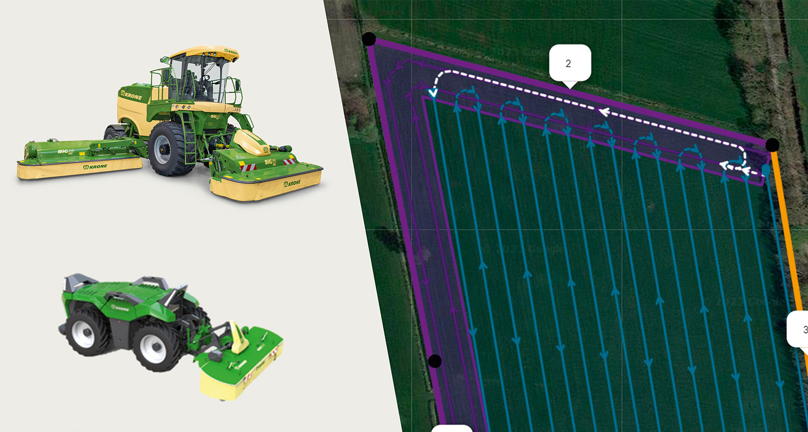 KRONE and Lemken in collaboration with software specialist Lacos are now offering a system for fully automated field work for the self-propelled mower conditioner BiG M and the autonomous process unit (VTE). Innovative tyre track planning not only ensures efficient mowing, but also selectively protects against wildlife mishaps.