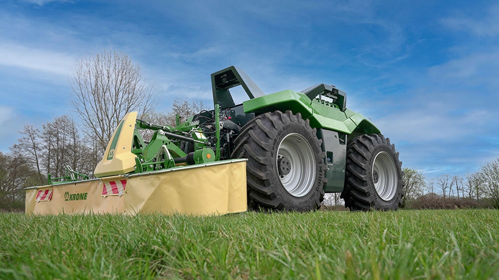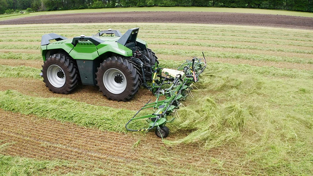 Both prototypes impressed by an excellent quality of work, high work rates and traction as well as plenty of lugging power and of course superb soil protection. Depending on the specific application and machine attached, the weight of the 2.70m wide and 2.60m high unit is between 7.5t and 8t. Fitted with 23inch wheels all-round, the process unit is powered by a fuel-electric drive and delivers 170kW (230hp) – enough to take on any of the tasks it is designed to carry out: ploughing, cultivating, seeding, mowing, tedding and raking. This level of versatility guarantees an excellent year-round utilisation.