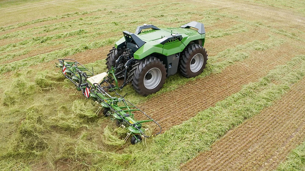 The unit was designed with the input requirements of the mentioned processes in mind. Its diesel engine develops a maximum power of 170kW (230hp) which is transferred electrically to the wheels and pto. The attachments are coupled to a three-point linkage. The base machine boasts multiple and extensive sensor systems which monitor the immediate surroundings and the attachments. The focus is on safe operation and optimum results. Operators control and monitor the combination from a mobile device, sending jobs and job reports through a communication module and via the established agrirouter data exchange hub.