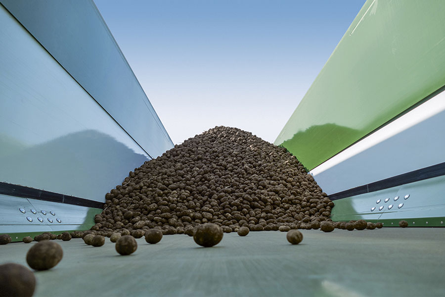 The 2000mm wide and 3.6mm strong floor belt offers a 50t break strength and a PVC surface which has two layers of polyester textile embedded into it. The smooth underside reduces friction for non-stick operation. The tensioned floor moves in either direction and will not billow up in empty hauls. The consistent unloading rate leads to a uniform mat and also reduces the strain on the floor. Another advantage is that the belt offers a cushioning when loading strain vulnerable crops like potatoes.