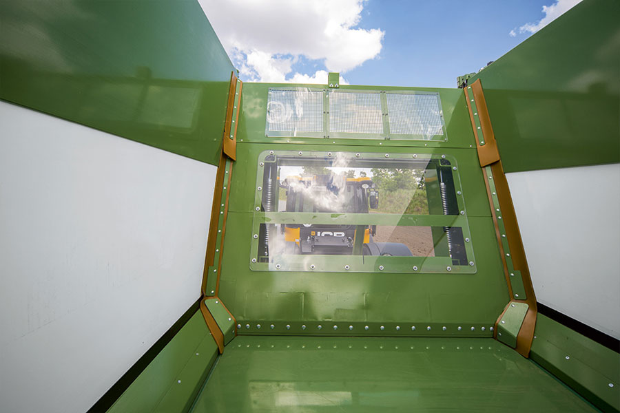 The mobile headboard is made of 10mm polymethylmethacrylate acrylic glass for a clear view into the cargo space. As the floor is pulled consistently to the rear, the machine is cleared effectively. Equally practical are the rubber strips that seal the sides for loss-free fillings with small grained crops such as grain or oilseed rape.