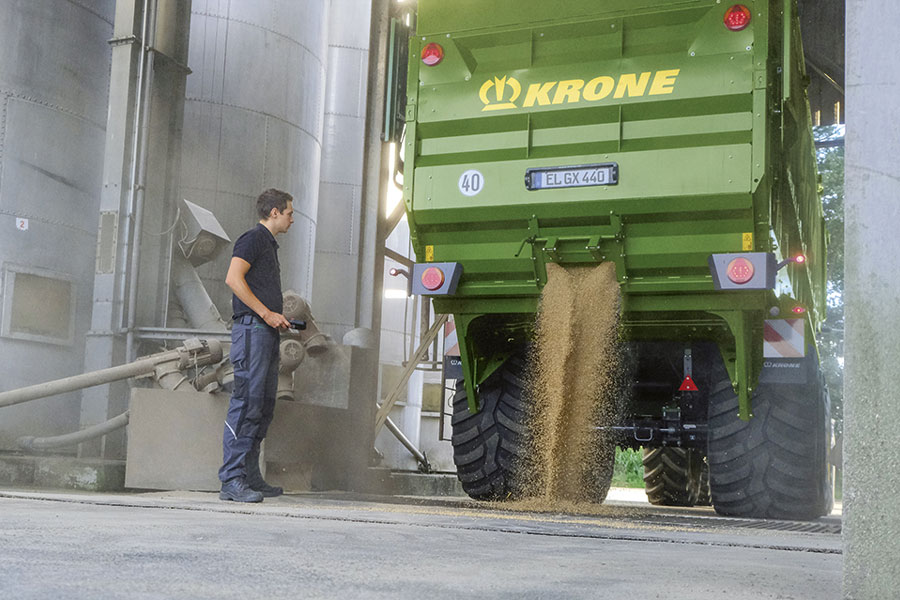 Spelle, September 2021. GX stands for general-purpose wagon, the most recent addition to the KRONE forage wagon range. This wagon offers a new level of versatility and gentle and fast unloading of a wide variety of cargo. The new machine is available in two sizes – 44 m3 and 52 m3 – with two optional discharge rollers. The GX 440 rides on tandem axles and the GX 520 on a tridem unit, with both models featuring standard Isobus operation.