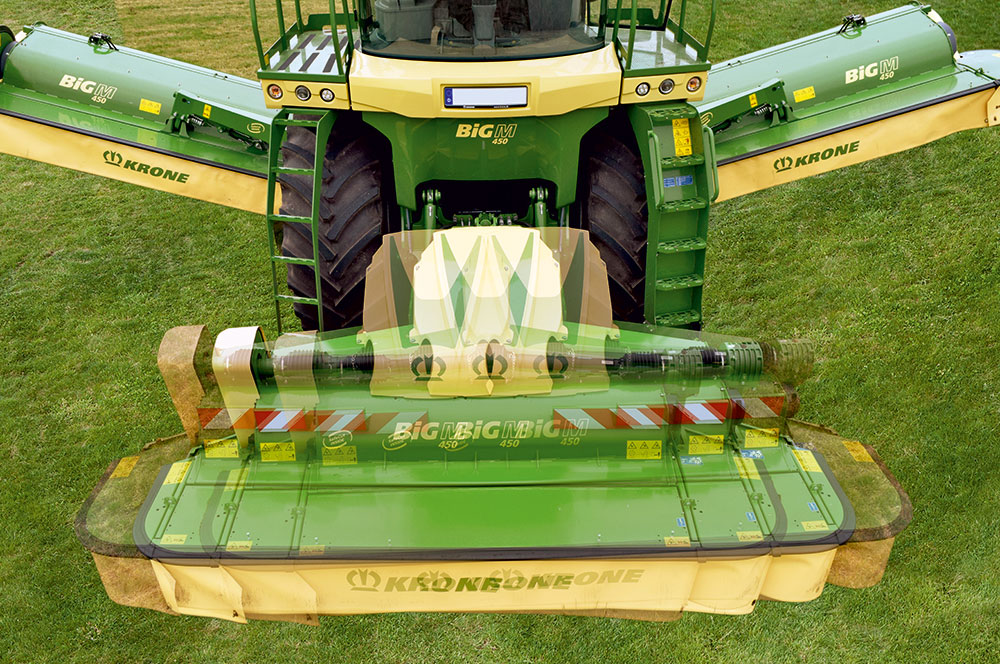 Spelle, April 2022 - KRONE introduces a new feature on the BiG M self-propelled high-performance mower conditioner and its front mower. The side-shifting mechanism on the front mower which is now available as an auto feature that adjusts the side-shift relative to the current slope gradient. The benefit of this is no striping in sloping fields and curved lines.