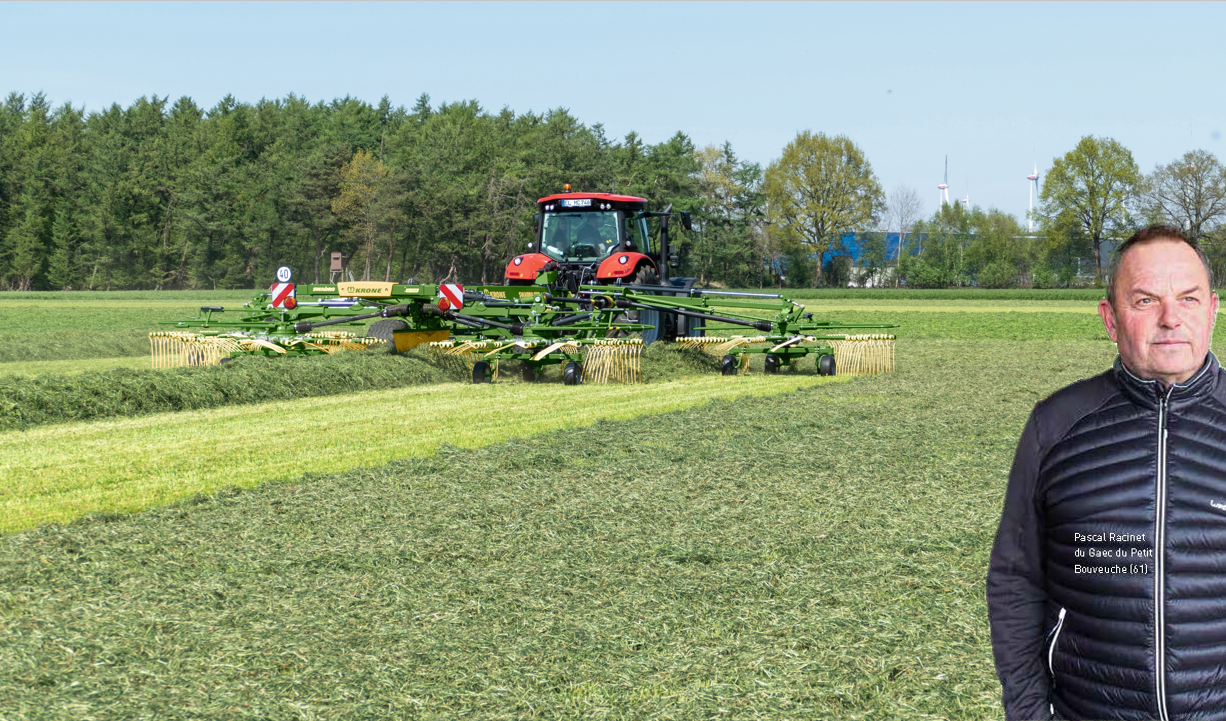 Valentin Fillieul et Pascal Racinet, les deux associés du Gaec du Petit Bouveuche dans l’Orne, exploitent 250 ha de prés de vallée. « Nous sommes dans une région qui, historiquement, produisait peu de lait sur de grandes surfaces. Pendant la période des quotas laitiers, pour augmenter notre production laitière, nous avons dû reprendre beaucoup de terres » explique Pascal Racinet. Il s’est donc lancé dans le commerce de foin pour valoriser leurs nombreux hectares de prairies naturelles. Avec les deuxièmes coupes, les regains et les 40 ha d’ensilage de dérobées destinés à leur troupeau de 120 vaches laitières, ce sont plus de 500 ha d’herbe qui sont fauchés et andainés chaque année. La récolte du foin se fait en 4 jours. Le premier jour, l’herbe est fauchée et fanée dans la foulée. Le deuxième ainsi que le troisième jour, elle est fanée. Le quatrième jour, elle est encore fanée puis andainée et pressée en balles carrées. Les ballots de foin sont ramassés et stockés sous abri le jour même. « Le jour du pressage, nous sommes au minimum 4 sur le chantier » précise Pascal Racinet. Les deux associés se sont équipés d’un combiné de fauche de 11 m, d’une faneuse de 16 m, d’un andaineur quatre rotors de 12,5 m et d’une presse à balles cubiques avec un pick-up de 2,35 m, tous de la marque KRONE. « Nous pouvons avoir jusqu’à 130 ha fauchés qui attendent d’être récoltés » commentent les deux éleveurs . Malgré son débit important , la presse était le facteur limitant dans la chaîne de récolte car elle ne pouvait pas être exploitée à pleine capacité. « Comme nous courrons toujours après le temps, il faut maximiser son débit pour botteler au moins 50 ha par jour » explique Pascal Racinet. Pour augmenter les surfaces pressées par jour, il faut l’alimenter avec des andains volumineux et donc, travailler sur une grande largeur. Avant l’achat d’un andaineur quadri-rotors, les exploitants utilisaient un bi-rotors à dépose centrale de 10 m de large. A l’usage, ils ont expérimenté que « la largeur de travail effective ne dépassait pas 8,5 m car, quand la machine était déployée à son maximum, l’andain formé était trop large pour le pick-up de la presse ». Ils l’ont remplacé par un andaineur KRONE Swadro TC 1250, une machine à 4 rotors de 12,5 m de large. « Je peux vraiment travailler sur toute sa largeur car l’andain ne dépasse pas 2,2 m » constate Pascal Racinet après quelques mois d’utilisation. Une autre solution aurait été de s’équiper d’un bi-rotors à dépose latérale pour regrouper plusieurs andains. Pour Pascal Racinet, « la dépose centrale a l’avantage de former un andain plus régulier, plus tassé, moins torsadé et donc plus facile à ramasser avec le pick-up de la presse ». Le Swadro TC 1250, sans commande isobus, est le modèle d’entrée dans la technologie 4 rotors chez KRONE pour un prix catalogue de 80 000€ TTC (autour de 65000€ HT - 5200€ HT / m). La largeur de travail est comprise entre 9,8 m et 12,5 m pour une largeur d’andain de 1,4 m à 2,2 m. Les deux exploitants ont choisi la marque KRONE « pour la robustesse des machines et pour la qualité de ramassage » qu’ils jugent au nombre de bras sur chacun des rotors. Le TC 1250 est équipé, à l’avant, de rotors de 3,3 m de diamètre dotés de treize bras et de rotors de 2,96 m à quinze bras à l’arrière. Les rotors avant tournent 1,25 fois plus vite que ceux à l’arrière pour projeter l’herbe (et non la déposer en andain) vers les rotors arrière, ce qui contribue, selon le constructeur, à la qualité de l’andain. Les rotors tournent à sec grâce à des boîtiers à roulements à billes hermétiques qui ne nécessitent aucun graissage. Chaque bras est équipé de quatre doubles dents avec un profil courbé vers l’avant. Cela leur permet de soulever le fourrage qui pèse moins sur le bas des dents ; celles-ci reculent donc moins vers l’arrière en travaillant. Selon le constructeur, ce dessin des dents permet de positionner les rotors 1 cm plus haut qu’avec des dents droites. « Nous qui avons des silex dans nos prairies, nous pensons que cela limitera l’usure des dents » anticipe Pascal Racinet. La hauteur au sol se règle indépendamment pour chaque rotor avec une manivelle et un contrôle visuel sur une échelle graduée. La suspension des rotors avant est hydraulique et celle des rotors arrière par ressorts. Les largeurs de travail et de l’andain se règlent en jouant sur les distributeurs hydrauliques du tracteur directement depuis la cabine. Pour Pascal Racinet, « le TC 1250 n’est pas très différent en termes de mécanique, d’utilisation et d’entretien de ce que je connaissais avec mon andaineur à double rotors ». Il prévient, cependant, « qu’il faut un tracteur lourd pour ne pas se laisser entrainer par la machine qui pèse quand même 5,2 tonnes. Il faut-être vigilant sur la route ».