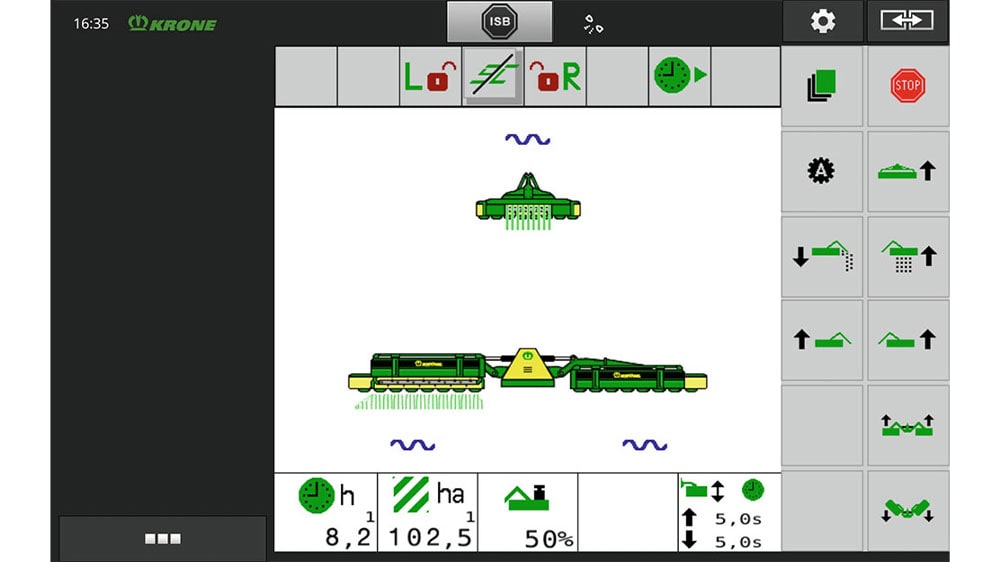 The swathing decks open and close hydraulically for convenient selection of three swathing modes - regular, independent and no swathing, each selected from the tractor cab and on the move. A particularly innovative feature is the independent swathing option. This means with one swath board closed, the EasyCut B 950 Collect groups 12m of crop into four swaths – ideal for the four-rotor rake Swadro TC 1250 / TC 1370 from KRONE and efficient chain management in ever hotter and drier summers, saving time and inputs throughout the harvest chain – in the name of sustainability.
