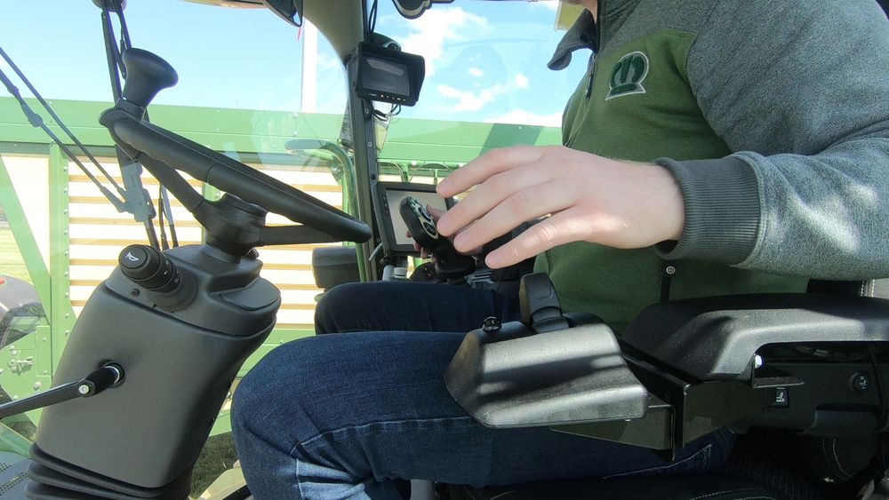 The joystick requires only minimal movement of the left hand while the forearm lies relaxed on the armrest. Offering easy and precise operation of the machine, the innovation gives drivers maximum control of the machine, reduces steering effort and enhances comfort as the driver sits much more relaxed than on a wheel-steered machine. Easing the strain, especially on long working days, the joystick allows operators to pay more attention to the chopping quality itself.