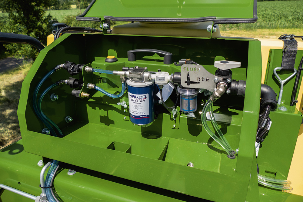 The KRONE system comprises an approx. 400-litre tank that is mounted behind the yoke on the tube steel frame. The tank has a large filling opening with a sieve and labyrinth ventilation and a filling level sensor. The current filling height is indicated on the cab-mounted terminal screen, and operators can pre-set whether and at which filling level an alarm is signalled. The pump is housed in a box above the yoke where it is well protected from the ingress of dust and at the same time is easy to get at.