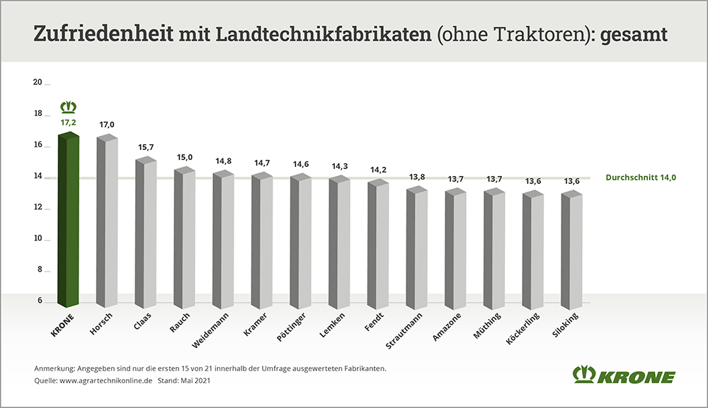 Spelle, June 2021. How satisfied are German trade dealers with their product brands? This question was asked by the LandBauTechnik Bundesverband e.V. (LBT) association in a second survey among all agricultural machinery dealers who are organised in the LBT. On a scale from 0 (very bad) to 20 (best), the participating dealers were asked to score the individual brands.  578 dealers participated in the survey (previous year 478) the results of which have now been published, showing a clear picture: Scoring 17.2 points on average, KRONE secured once again first place.