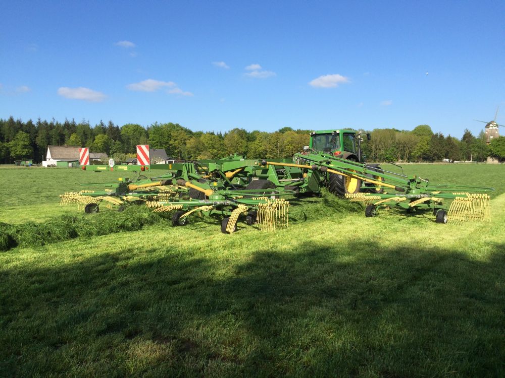 Each rotor carries 13 tine arms for even cleaner work and features the impressive Krone Jet Effect, which raises the leading end of the rotor first, preventing the tines from scratching the ground during lift-out and lowering. This is feasible thanks to the rotors’ cardanic suspension which shifts the centre of gravity.